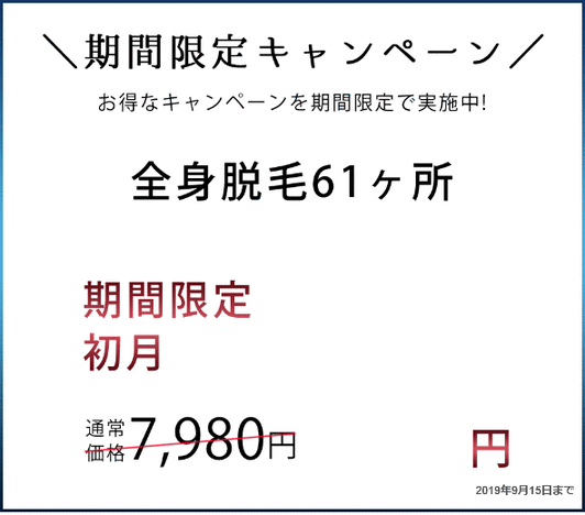 ・ レーザー級の脱毛効果 !? 希少!!最新のSHR脱毛方式を採用 だから肌に優しい!痛くない! ・10万以下で全身脱毛が完了できる!? シェービングやジェルなど 追加料金は一切なし!本当に安い!! ・最短6ヵ月で全身脱毛完了!! 毛周期に関係なく脱毛できるから 来年の夏までだったら余裕で間に合うね☆ ・エステ級のアフターケアがすごい!!! 全身保湿で驚くほどお肌がプルプルに… 特製フェイスパックで化粧ノリも抜群! ・強引な勧誘一切無し!! 自分に合うプランを聞きに行く だけでも全然アリ! |